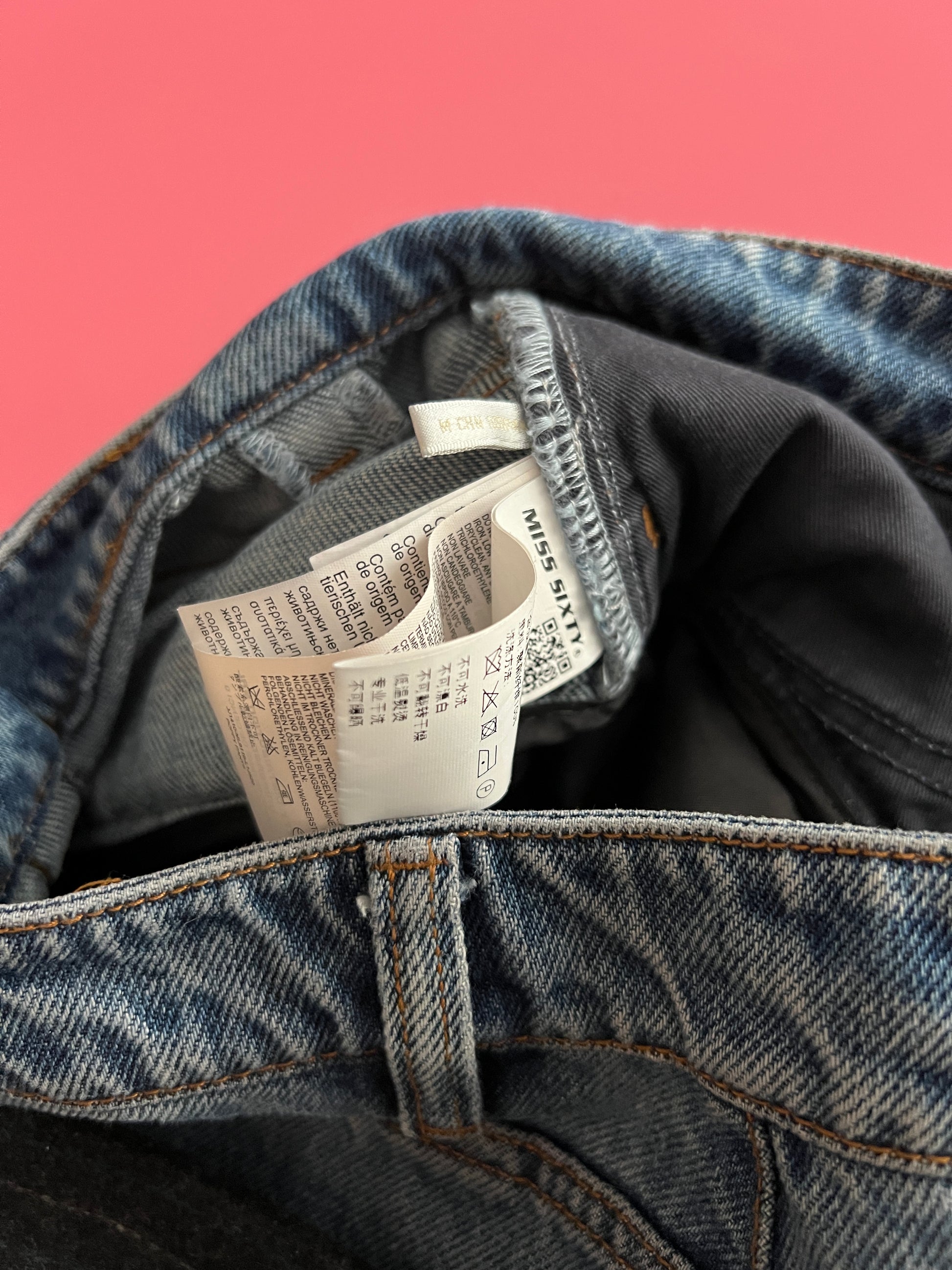 size xs/s. denim hem with wool pinstripe pant layered on top. very fun, very rare!